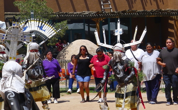 White Mountain Apache crown dancers at the Indian Pueblo Cultural Center. Note the rounded traditional clay oven, or horno, in the background.