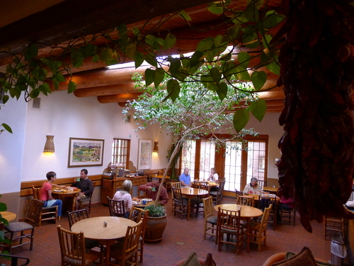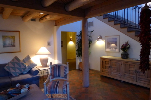 Immediately we were enchanted by the Inn’s leafy garden setting beside the Santa Fe River and its charming Pueblo-style architecture. Inside, warm woods, a kiva fireplace and authentic decorative elements in the lobby library spoke of simplicity and Southwest aesthetic. The Inn’s intimate scale, only 72 rooms, made check-in a matter of moments. Staff invited us to join other guests sharing the day’s experiences and making evening plans over complimentary wines and cheeses at the Inn’s daily reception. We lingered long in the easeful, welcoming atmosphere.