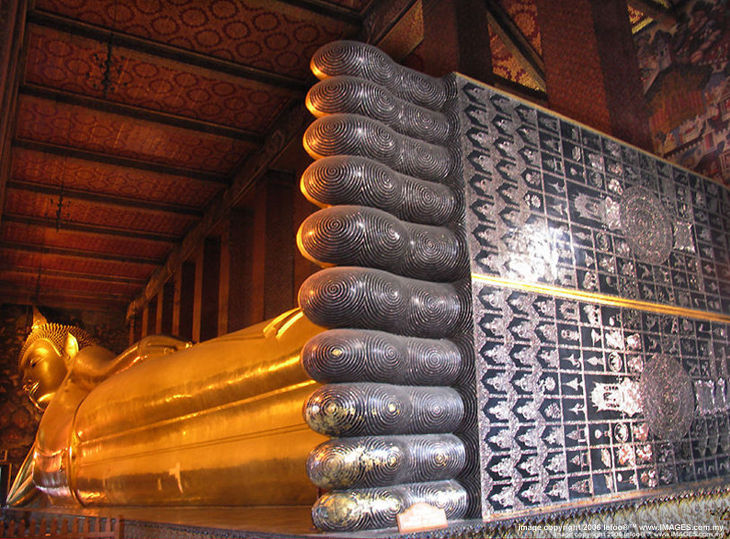 In artistic representations, the Buddha’s slim and perfectly proportioned body is an outer reflection of his inner spirituality. He has 32 lakshanas (special bodily features) that include golden skin, torso and cheeks like a lion, flat feet with long toes of same length, a protuberance on top of his head, curling hair and sapphire-blue eyes. Elongated earlobes hint at his early years when he wore weighty jewels. The Buddha is often depicted sitting on a lotus flower, symbol of purity rising out of filth.