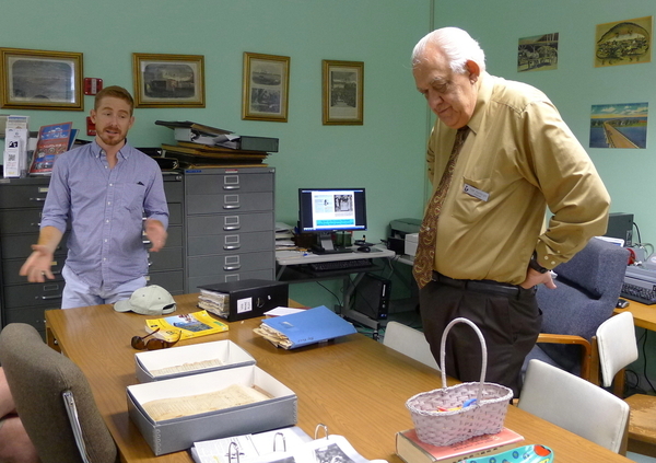 Poet Arlo Haskell (left) of Key West Literary Seminar and historian Tom Hambright (right) discuss Hemingway memorabilia in the Florida History Room of Key West public library.