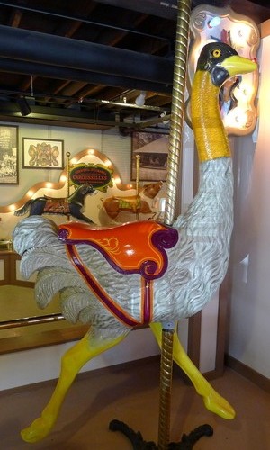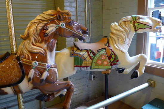 My first visit to the factory–now a museum–was pure magic. I peeked into the carving room and admired the historical display bright with color and fantasy. There were old kiddie cars, lovingly restored, and a small-scale merry-go-round for tots. Inside the roundhouse where workers once assembled mechanical wonders and shipped them as far away as Tahiti, the 1916 #1 Special carousel was a sight to behold. Thirty-six handcarved horses, over 580 lights, illuminated heads and handpainted scenic panels added to its magnificence.