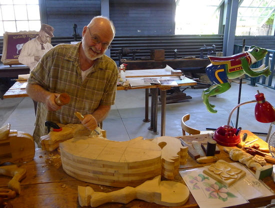 In the carving room, local artisans like Bill Miller demonstrate techniques on lightweight basswood.