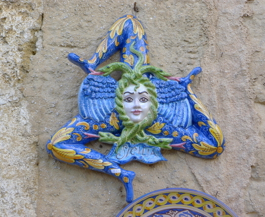 The trinacria is still the symbol of Sicily, appearing on everything including the region’s flag, though in that case the snakes coming from gorgon Medusa’s head have been updated to less-threatening wheat sheaves.